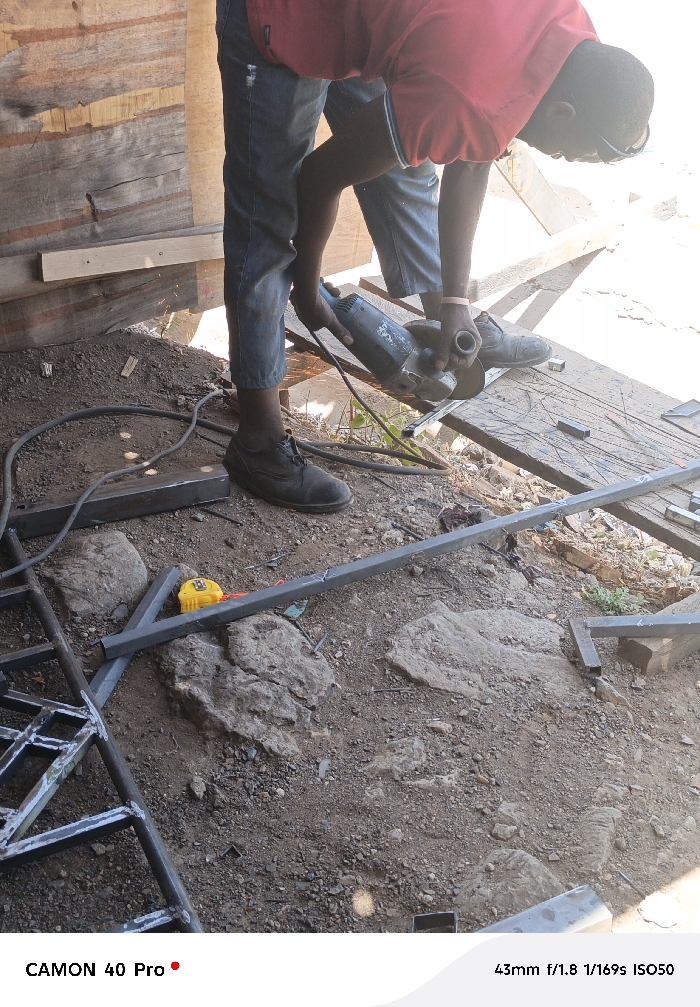 A man in a red shirt and jeans cuts metal with a grinder, creating sparks. He wears eye protection and leather shoes, but no other apparent safety gear. A measuring tape lies on the ground amongst rocks and metal scraps. A metal gate or frame is partially constructed in the foreground. The setting appears to be an outdoor workspace or construction site.