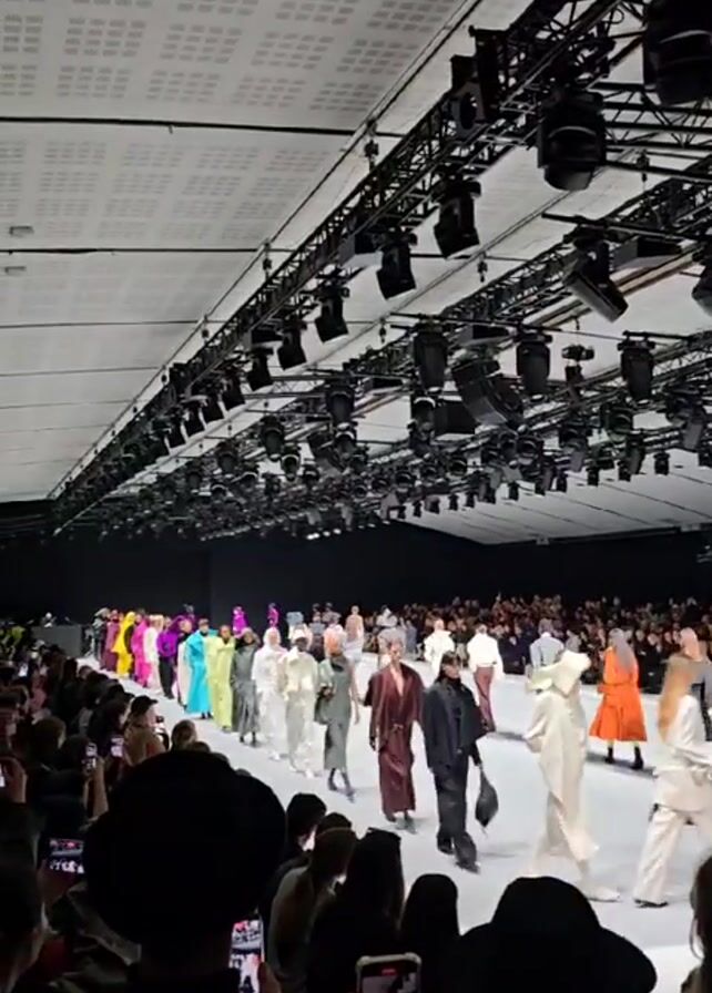 A fashion show runway is packed with models walking in a variety of different colored outfits. The lights are bright and there are many people in the audience recording the event on their phones.