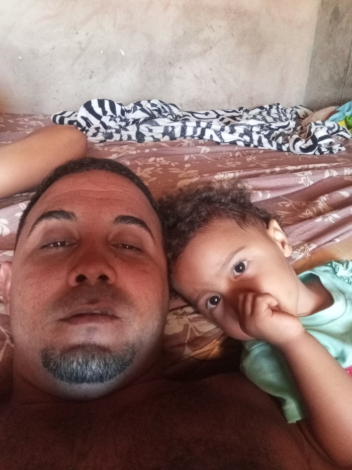Two individuals, an adult male and a young child, are depicted in a selfie-style photograph, lying down in an indoor setting in El Tacal, Venezuela