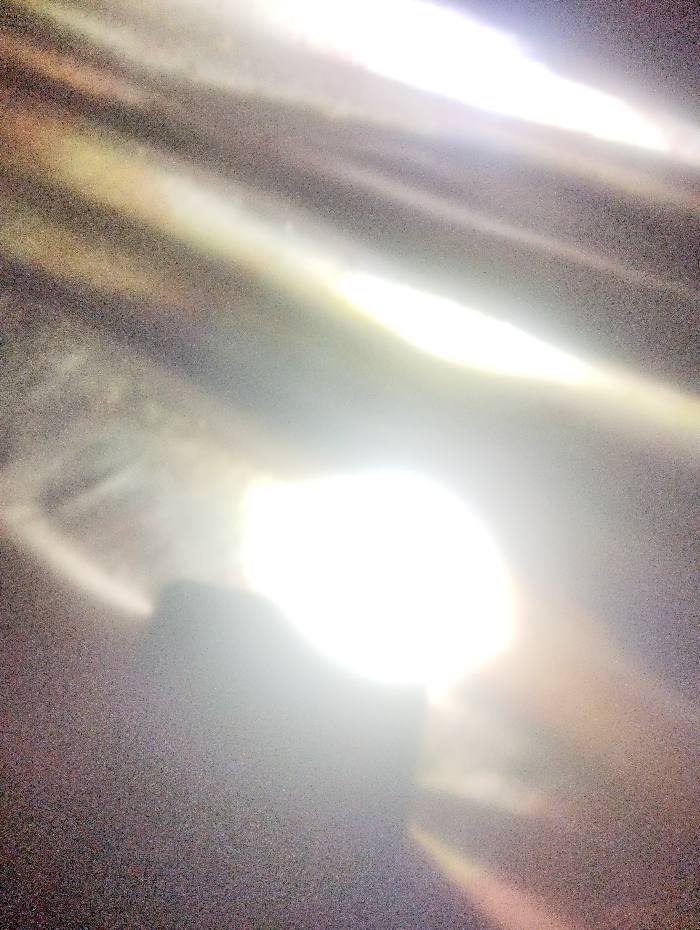 The image presents an abstract composition of light and shadow. Bright, elongated streaks of light dominate the frame, contrasting with darker, blurred areas. A central, intensely bright region appears almost circular, radiating light outwards. The overall effect is ethereal and unclear, with no easily identifiable objects or forms discernible. The texture appears grainy and somewhat obscured.