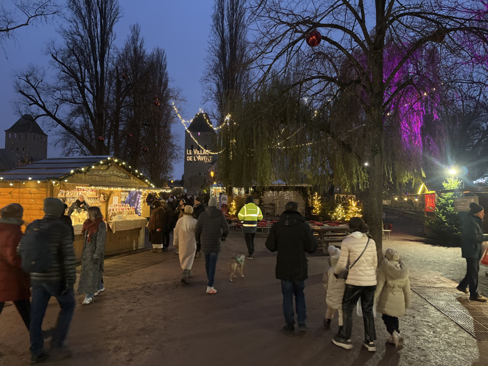 A Christmas market scene at twilight showcases people strolling amongst wooden vendor stalls adorned with lights. Towering stone structures with illuminated French text “LE VILLAGE DE L’AVENT” stand in the background. Bare trees are present, some decorated with large red ornaments and pink spotlights. Patrons wear winter clothing, while a person in a yellow vest navigates the crowd with a dog. Small, decorated Christmas trees dot the landscape.