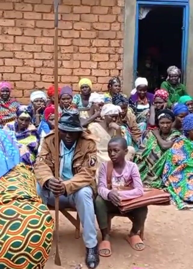 large group of people gathered in an outdoor setting. The majority of the people are women, wearing colorful clothing and head wraps. They are seated on the ground. Several men are standing, and one man appears to be speaking to the crowd. There is a young girl sitting on a stool next to a man in a brown jacket and hat. In front of them on the ground is a plate with an object on it, along with a loaf of bread, a jug, and cups. The background shows a brick building and a larger crowd of people standing further away. The overall atmosphere suggests a gathering or ceremony.