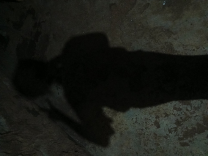 The image displays the dark, full-body silhouette of an individual standing indoors or within an enclosed, dimly lit space in Witeithie ward, Kenya. The silhouette's right arm is raised, with the hand positioned near the head, forming a distinct two-finger V-sign. The background consists of irregularly textured, rough surfaces consistent with stone or concrete, illuminated faintly, which serves as the canvas for the cast shadow. The ambient light source is not visible, but its presence is indicated by the sharply defined shadow.