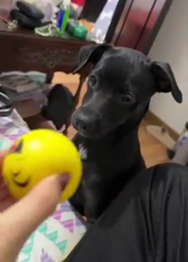 A close-up, eye-level shot depicts a small black dog sitting up on a bed or lap, watching a yellow ball being held and moved by a person