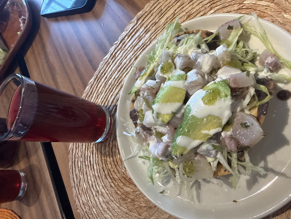 - "A plate of tostadas de ceviche, topped with white fish, avocado, lettuce, and a creamy sauce, rests on a tan woven mat" by FM-uvcyJ3, licensed under CC BY 4.0