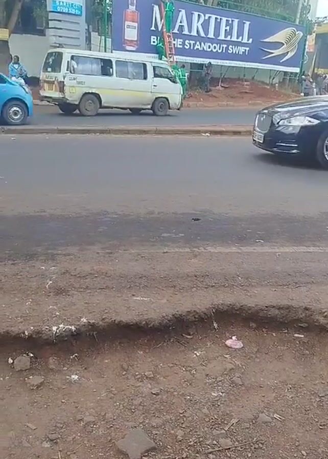 roadside scene. A road with moderate traffic is visible. On one side of the road, a large billboard advertising MARTELL is being worked on by two individuals in green uniforms on a ladder. Vehicles including a blue sedan, a white van, and a dark blue Jaguar drive past on the road. The foreground shows a rough, unpaved area with some debris. A sign for James Gichuru Church and Gertrude's Children's Hospital is visible in the background. The overall setting appears to be an urban environment.