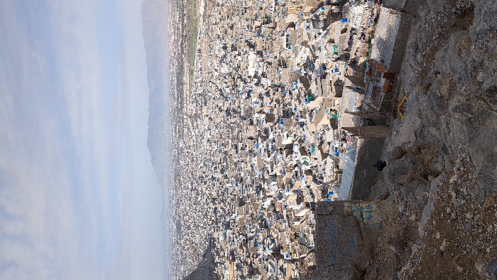 The image displays a panoramic, high-angle view of a densely populated urban area identified as Quetta City Tehsil, Pakistan, under a partly cloudy sky. The perspective is from a steep, rocky, arid hillside in the foreground, characterized by grey and brown stones, loose dirt, and minimal dry vegetation. A prominent, angular rock face on the left side of the foreground features blue and white graffiti. Below this viewpoint, on the descending slope, are several rudimentary structures or walls, some appearing partially collapsed or constructed from rough stone and concrete. A single individual, dressed in dark clothing, is positioned on this rocky slope, appearing to sit or crouch, facing towards the extensive city. The midground and background are dominated by a sprawling urban landscape comprised of hundreds of tightly packed, low-rise buildings, typically one to three stories in height. These structures exhibit varied earthy tones of beige, brown, and grey, suggesting construction from stone, concrete, and plaster. Numerous rooftops are flat, with a notable presence of blue tarpaulins or sheeting covering some, indicating waterproofing or temporary shelter. The city's layout appears irregular, with dense residential clusters and narrow, winding pathways largely devoid of significant green spaces. In the far distance, the urban area fades into a haze, met by a range of blue-grey mountains on the horizon. The sky is a light blue with scattered white, wispy clouds. No specific actions or interactions are discernible among the structures or in the wider cityscape.