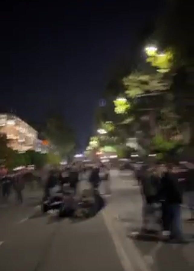 The video depicts a street scene at night. A crowd of people is present, some standing and walking, while others are sitting on the road surface. The road is lined with trees and streetlights. Buildings are visible on both sides of the street. The lighting is dim, and the overall mood appears calm but possibly charged due to the gathering of people. The camera moves steadily, providing a view of the scene.