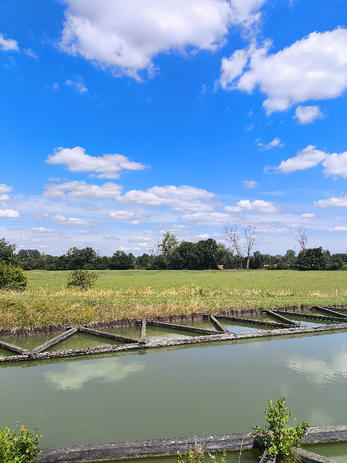The image depicts a rural landscape in Waltenheim-sur-Zorn, France, under a clear blue sky with scattered white cumulus clouds. The foreground features a calm, greenish-brown body of water, possibly a canal or irrigation channel. Along the closest bank of this water body, a dark, weathered concrete or stone barrier is visible. Extending into the water from this barrier, and running parallel to the bank, are a series of dark, angular structures forming an array of trapezoidal or triangular sections. These structures appear to be constructed from horizontal beams and vertical posts, creating a patterned containment or flow-management system. Reflections of the blue sky and white clouds are visible on the water's surface. Beyond the water body, a wide, flat field of green and yellowish-brown vegetation stretches into the midground. A dense treeline of dark green deciduous trees forms the horizon in the background. Scattered within the field or along its edge are several individual trees, including some with light-colored, bare branches, suggesting dead or dormant specimens. No people or animals are present in the scene. The lighting suggests daytime conditions.