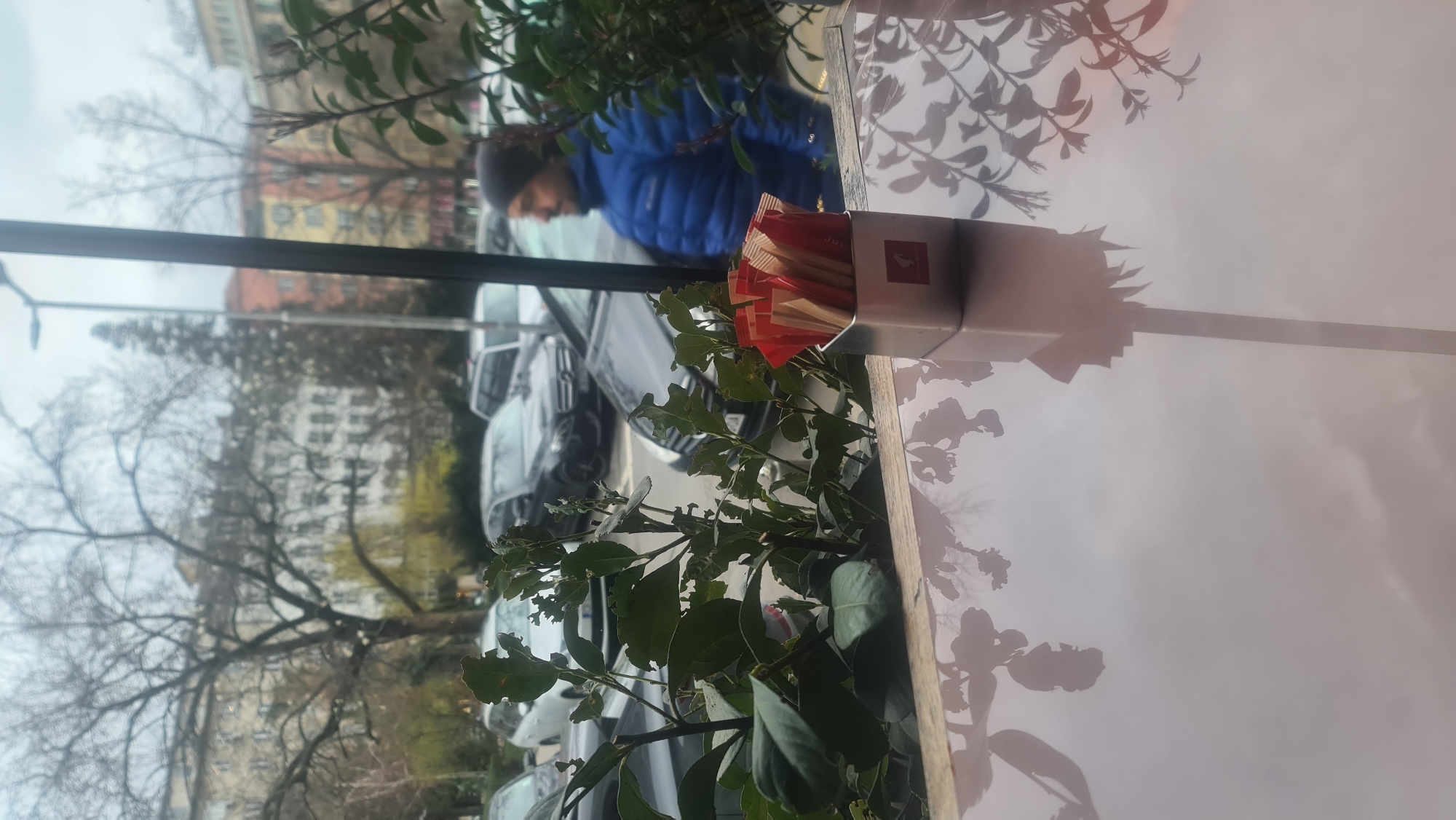 The image, taken from within a building looking outward, shows a man wearing a blue jacket and a dark beanie partially visible. Behind him is a street scene with several parked cars and buildings. In the foreground, there's a metal container holding sugar packets, along with greenery positioned on a white surface. The scene gives a blurred impression of the city outside the window of what could be a cafe or restaurant, potentially located in Sofia, Bulgaria, given the architectural style and ambiance typically found in the area. The lighting suggests it's daytime, and the foliage casts shadows onto the surface.