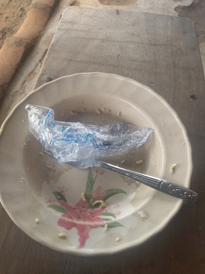 A ceramic plate with a floral design is on a wooden surface. The plate is empty except for a few pieces of food and a plastic bag lying on top of it. There is also a stainless steel fork on the plate. The coordinates provided are in the city of Asuir, Nigeria. It appears to be a simple scene, possibly a meal that has been eaten and left behind.