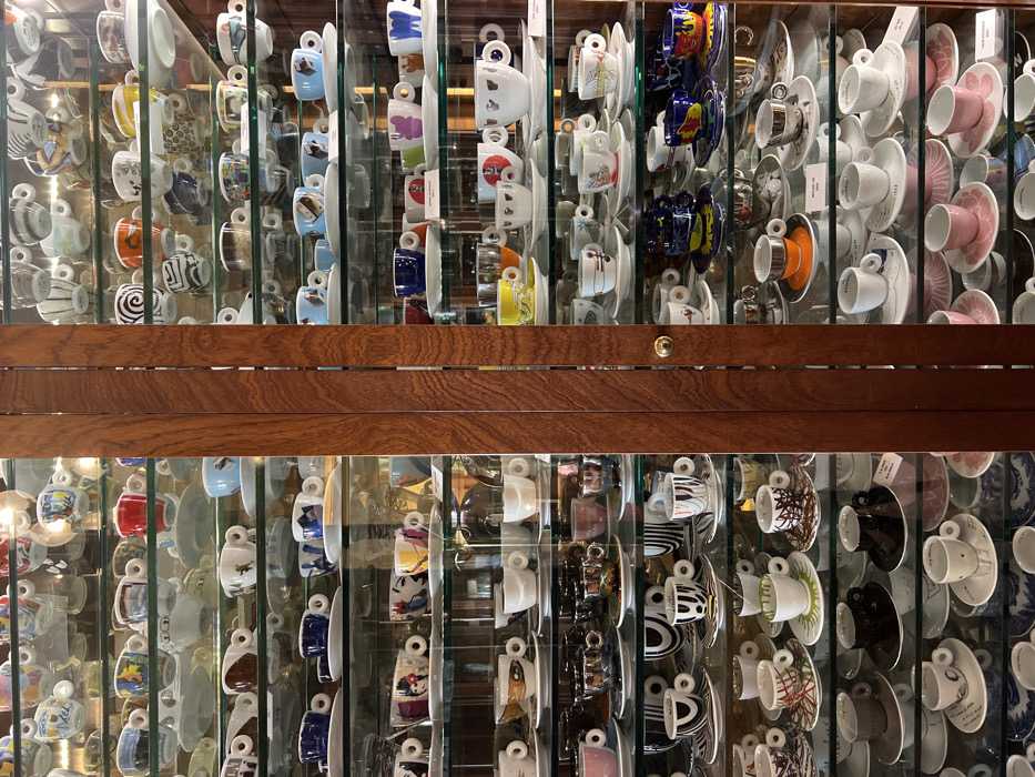 The image displays a tall, glass-fronted display cabinet filled with an extensive collection of espresso cups and saucers, located in Montepulciano, Italy