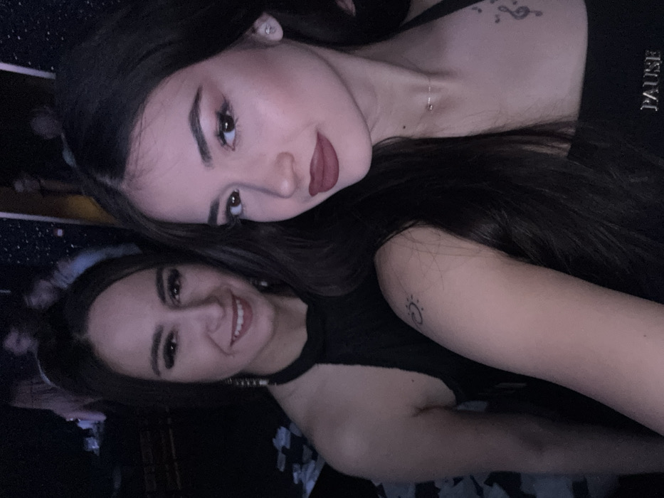 The image displays two young adult females posing for a photograph within a dimly lit indoor entertainment venue in the city of Plovdiv, Bulgaria. The primary subject, positioned in the right foreground, has long dark hair, features prominent eye makeup with winged eyeliner and reddish-brown lipstick, and wears a dark-colored halter-neck top with the inscription "PAUSE" on the chest. A small stud earring is visible in her left ear, and she exhibits a tattoo of a stylized sun/moon design on her upper left arm and faint musical notes on her upper chest. Her gaze is directed towards the viewer. The secondary subject, positioned behind and to the left, also has long dark hair and wears a dark halter-neck top. She is smiling broadly, with long dangling earrings visible. The background is dark and blurred, revealing several indistinct figures, consistent with a crowded nightlife environment. The overall lighting is low, suggesting artificial illumination.