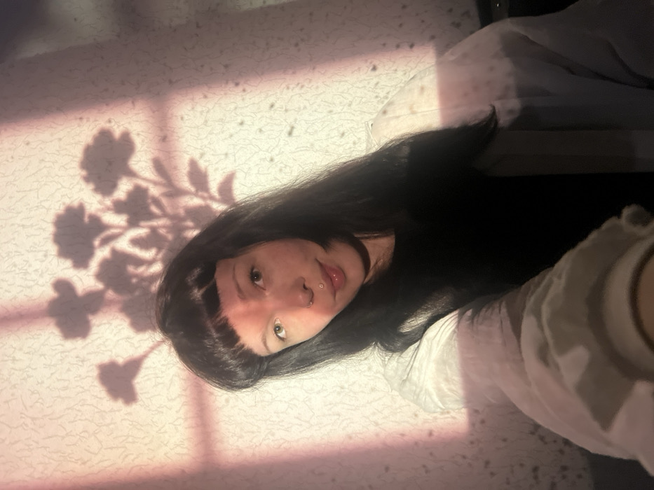 The image displays a young adult female situated indoors in Chaikovsky, Russia, capturing a selfie. She is presented from the chest up, possessing long, dark hair with bangs, light-colored eyes, a nose ring in her left nostril, and a philtrum piercing. She wears a dark undershirt beneath a light-colored, long-sleeved outer garment. Her expression is a slight smile directed at the camera. The background features a textured, light-colored wall. The scene is illuminated by a warm, reddish-pink light originating from the left, which casts distinct shadows on the wall. These shadows include a clear cross-shaped window frame and multiple floral outlines with stems and leaves. The subject's face is partially illuminated by this light.