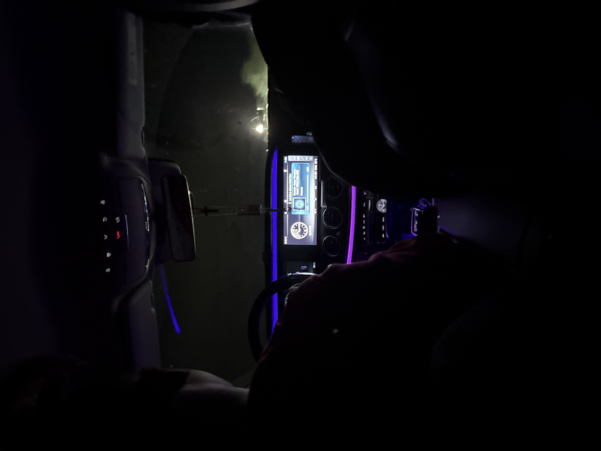 interior of a car at night, likely in Popovitsa, Bulgaria