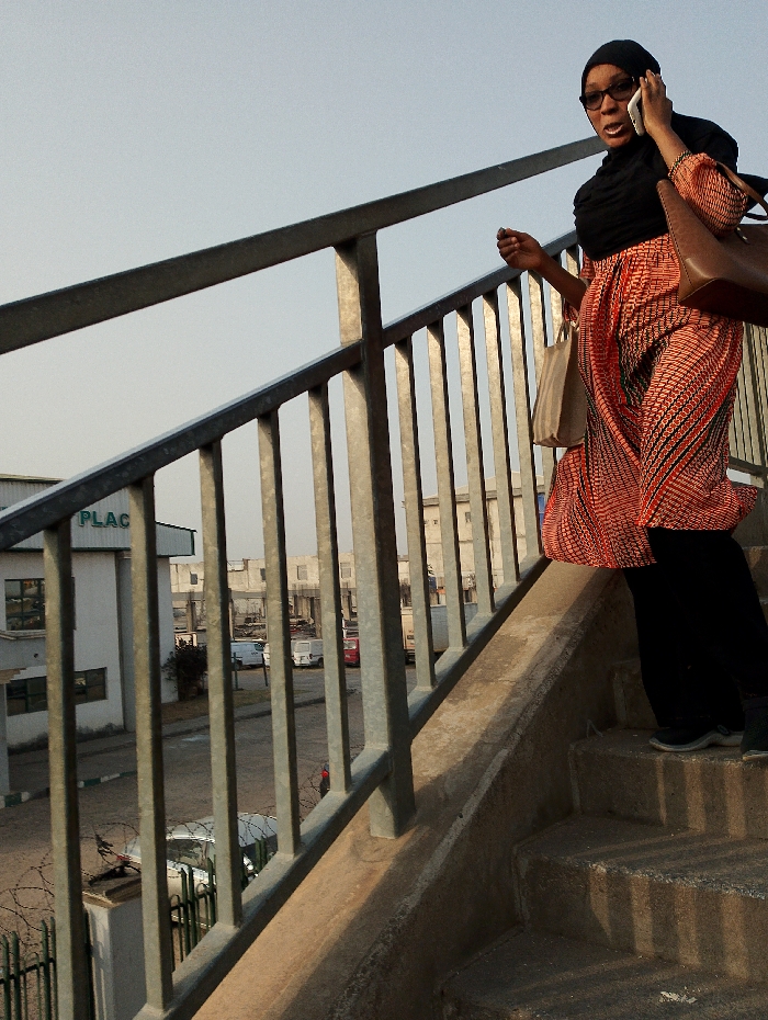 A woman is depicted descending a concrete staircase, part of a pedestrian overpass, in Kagini, Nigeria