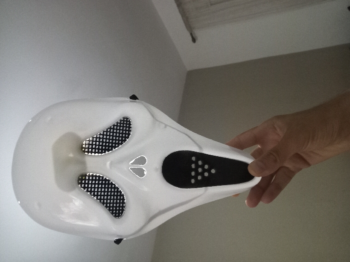 A white mask is being held by a hand, viewed from below. The mask features mesh-covered eye openings and a black triangular mouth section with circular vents. It resembles a stylized skull. The mask's shiny surface reflects light. The background includes a plain wall and a ceiling with a vent.