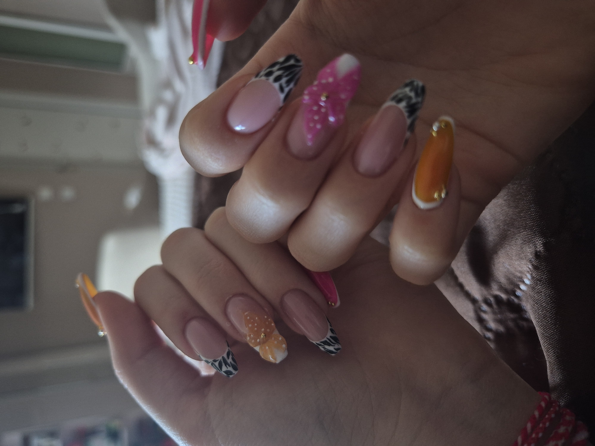 The image displays two human hands, presumably belonging to a single individual, showcasing elaborately decorated fingernails within an indoor setting in Pavlikeni, Bulgaria. The specific location or address within the city is not identifiable from the visual information. The left hand, positioned closer to the viewer and on the left side, exhibits five extended acrylic or gel nails. The thumb features an orange tip with a gold stud. The index finger has a pink base and a white tip adorned with a black animal print pattern. The middle finger is orange with white polka dots and three gold studs. The ring finger matches the index finger's design with a pink base and a white tip featuring a black animal print. The pinky finger displays a pink base with a solid pink tip and one gold stud. A red and white braided string bracelet is visible on the left wrist. The right hand, positioned further back and on the right side, also presents five extended acrylic or gel nails. The thumb is partially visible, showing a solid pink tip with a gold stud. The index finger features a pink base and a white tip with a black animal print design. The middle finger has a pink glitter base, a white tip, and three gold studs. The ring finger repeats the pink base and white tip with black animal print design. The pinky finger displays an orange tip with a white border and two gold studs. The hands rest on a brown, quilted fabric surface. The background is out of focus, revealing light-colored interior walls and indistinct furniture, possibly a bed, indicative of a private domestic residence. The lighting is soft and ambient.