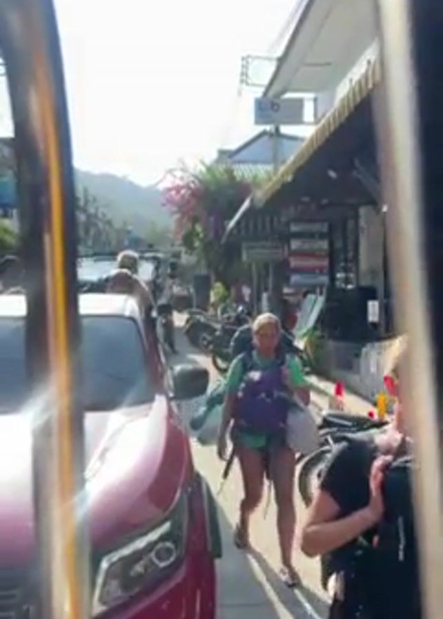 The video, shot from within a vehicle, presents a sunny street scene. Two light-skinned women, dressed casually in shorts and t-shirts, walk along the sidewalk, each carrying a backpack and what appears to be a bag. A red pickup truck is parked on the left side of the frame. Behind the truck and the women, the street is lined with parked scooters and various shops with signage. A mountain is visible in the background. The video is taken from a low angle, with the vehicle's internal structure partially obscuring the view.