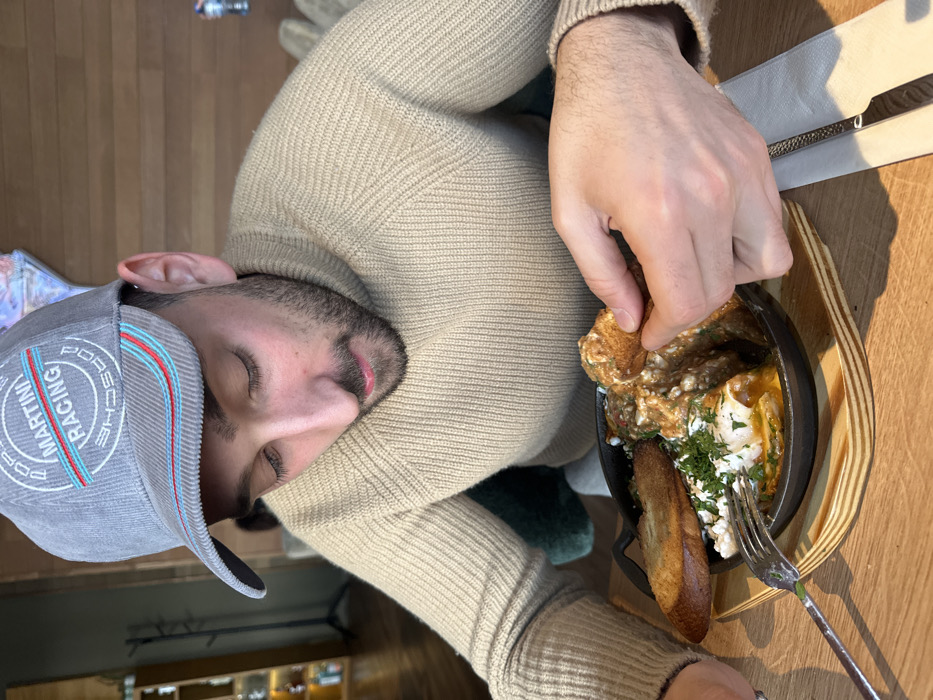 A male individual is depicted in an indoor setting, seated at a light-colored wooden table. He is wearing a beige ribbed turtleneck sweater and a grey corduroy baseball cap featuring the "PORSCHE MARTINI RACING" logo with red, blue, and light blue stripes. He has short dark hair and a beard/stubble. His gaze is directed downward at a meal served in a black cast-iron skillet, resting on a multi-layered wooden serving board. The meal consists of what appears to be baked eggs in a reddish sauce, topped with crumbled white cheese and green herbs. Two pieces of toasted bread are placed on the side of the skillet. The man's right hand is holding a piece of bread, dipping it into the meal, while his left hand holds a silver fork with a dark handle, positioned to the left of the skillet. A white paper napkin and a knife with a metallic handle are visible to the right of the meal. The background on the left shows a blurry shelving unit with various bottles or glassware. The background on the right features a wall with horizontal wooden paneling and a blurred, dark teal or green upholstered furnishing. The setting is consistent with a modern cafe or restaurant. The specific location within the city of Plovdiv, Bulgaria, cannot be determined from the visual information provided in the image.