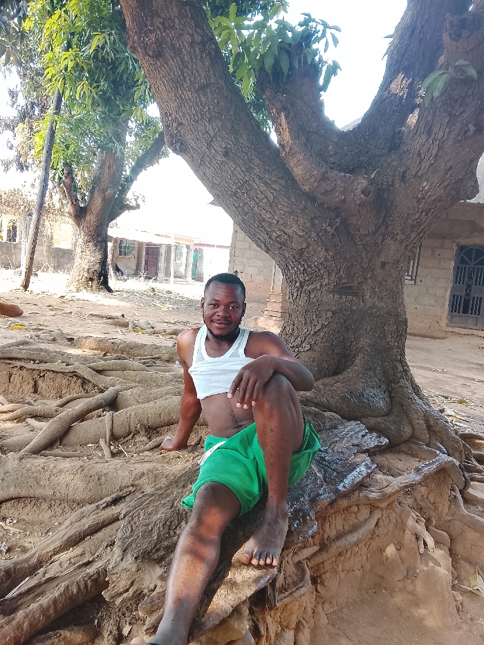 A single adult male is seated outdoors on prominent, exposed tree roots, positioned in the foreground of the image. The man has dark skin, short dark hair, and a beard, and is looking directly at the camera with a slight smile. He is wearing a white sleeveless undershirt, which is pulled up to reveal his midriff, and green shorts; he is barefoot. His right arm is bent with his hand resting on his right knee, while his left arm is extended behind him, hand resting on the roots. The immediate environment consists of dry, reddish-brown earth and numerous gnarled, thick tree roots that form natural seating. A large tree, from which these roots emerge, dominates the right side of the frame and extends into the upper background, providing a canopy of green leaves. Another mature tree is visible in the background to the left. In the mid-ground and background, several single-story buildings are visible. These structures appear to be constructed from light-colored blocks or unpainted render, with one building on the far left having visible windows and a corrugated metal roof. Another building to the right of the background features a dark-colored, possibly metal, door or gate. The scene suggests a semi-urban or residential outdoor setting within the city of Akwanga, Nigeria.