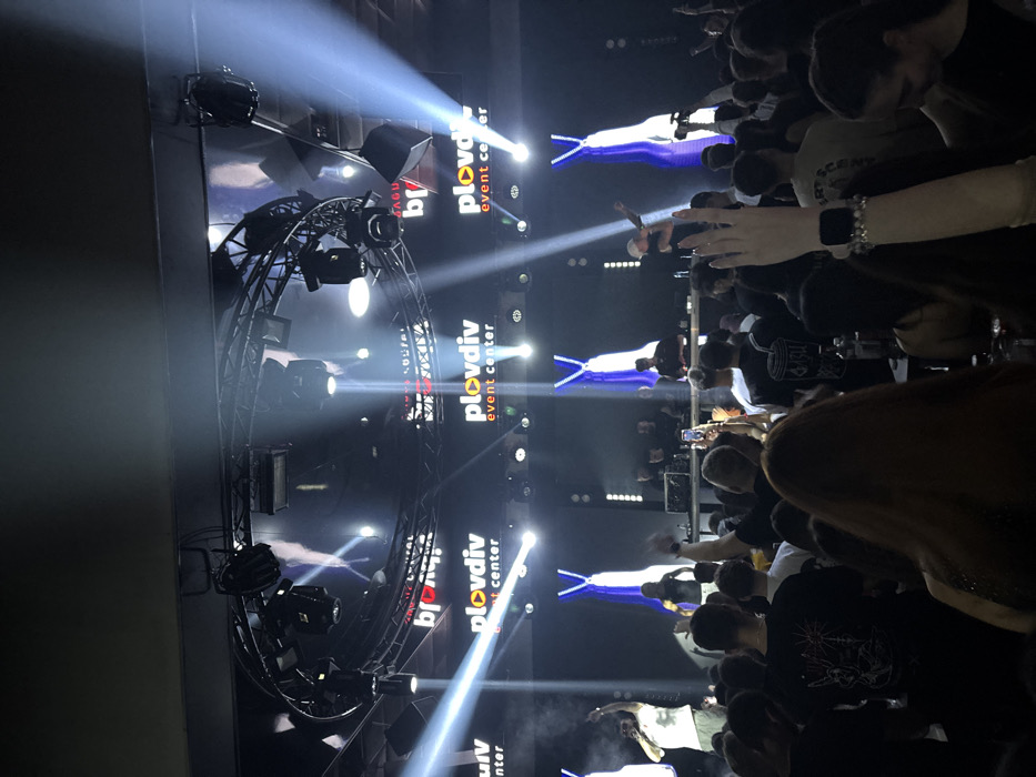 The image depicts an indoor live music event or concert taking place at the Plovdiv Event Center in Plovdiv, Bulgaria