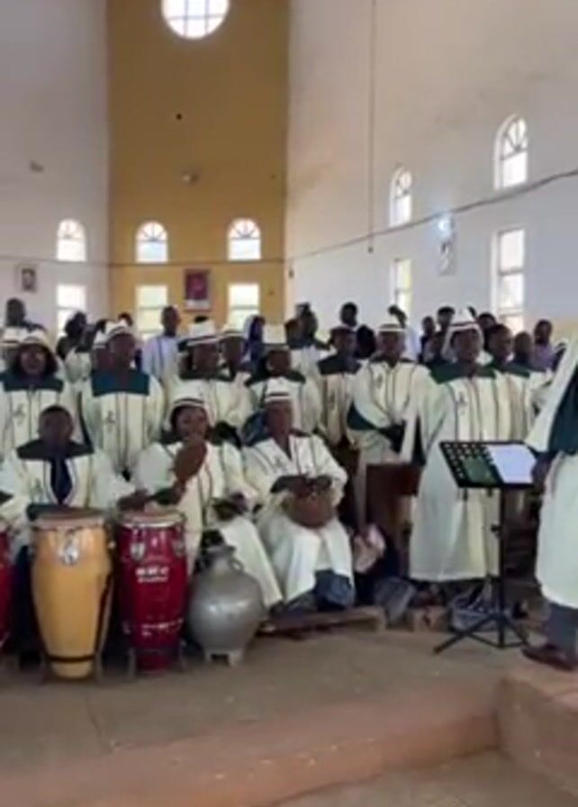 A choir group is performing in what appears to be a church. The choir members, comprising both men and women, are dressed in white robes with green accents and matching hats. They are positioned on a slightly elevated platform, with some members seated and others standing. Some choir members are playing percussion instruments, including congas and a clay drum. The setting is a spacious interior with simple architecture, including arched windows and a large round window near the ceiling. The walls are predominantly white, with a yellow section visible behind the choir. The building appears to be well lit by natural light streaming through the windows. Portraits are visible on the walls, adding a sense of tradition to the space. A music stand is positioned in front of the conductor.