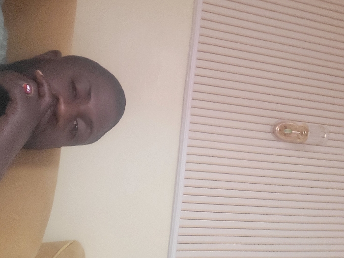 The scene is an indoor location in Babawa, Nigeria. A dark-skinned male is visible from the eyes down, occupying the lower half of the frame and looking directly forward. His right hand covers his mouth and chin, with a prominent red-stoned ring on his right ring finger. He is seated on light brown upholstered furniture, a segment of which is visible on the right. The upper background features light cream-colored vertical blinds or paneling. A small, transparent, cylindrical light fixture containing a green element is attached to this paneling in the upper right quadrant. A plain, light yellow wall is visible to the right of the blinds.