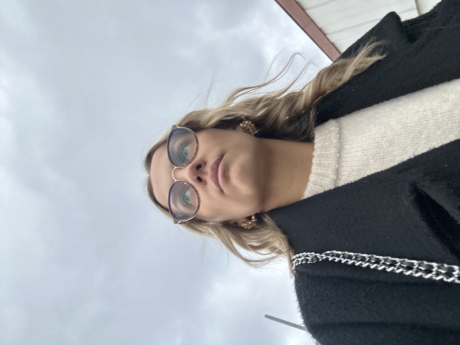 A young adult female is depicted in Villars, France, from a low-angle perspective, looking upwards under an overcast sky. She has blonde, wavy hair and wears eyeglasses with round gold frames and tortoiseshell accents. Gold-toned, ornate stud earrings are visible on both ears. Her attire consists of a cream knit sweater and a dark, textured overcoat. A shoulder bag with a silver chain interwoven with dark material rests on her left shoulder. The background features a light grey, cloudy sky. To the far left, a slender dark pole-like object is present. On the far right, a partial view of a building includes light-colored siding and a dark red roofline.