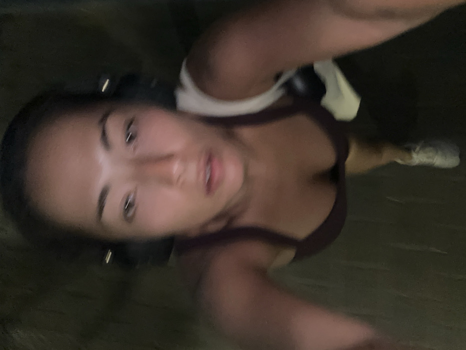 A low-angle, motion-blurred self-portrait captures a single adult female in a dimly lit environment. The subject's face, partially obscured by motion blur, is directed towards the camera with her mouth slightly open. She is wearing a dark-colored sports bra and dark over-ear headphones. A white garment or strap is visible on her left side. Her lower body shows one white athletic shoe on a dark, paved surface, which displays faint linear patterns. The background is uniformly dark and indistinct, offering no discernible features or landmarks. The specific location within Tel Aviv, Israel, cannot be determined from the visual information presented in the image.