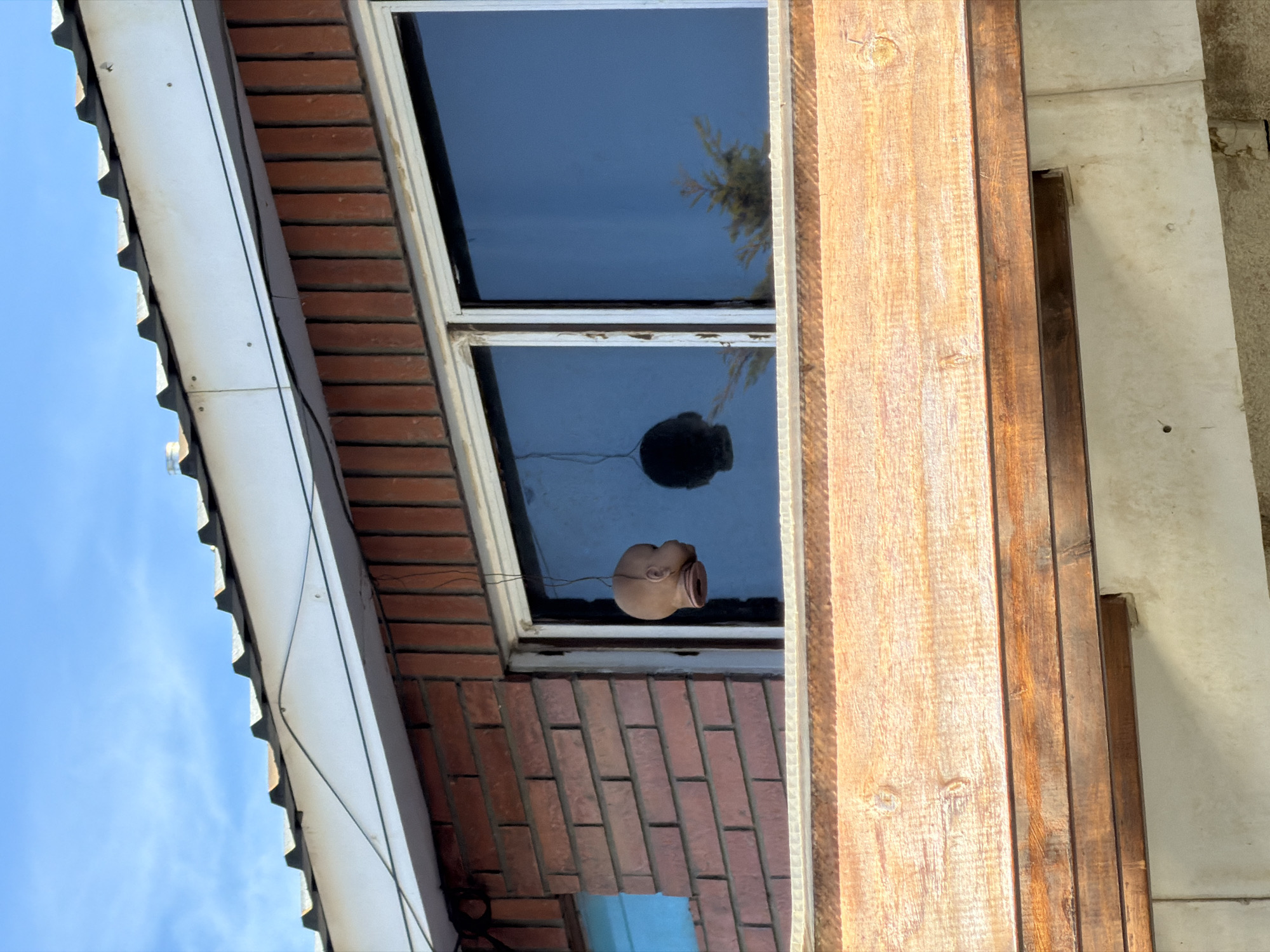 The scene shows a building exterior with a window reflecting the sky and possibly trees, and a peculiar detail: a doll's head hanging inside the window. The building has brickwork and wooden elements, possibly a frame or structural support. A section of a roof is visible, and the sky is clear blue. The presence of the doll's head is unusual and draws attention. The exact location in Ushuaia, Argentina, cannot be determined from the image. There is no indication of any people, interactions, or specific actions. The focus is on the building's architecture and the unsettling placement of the doll's head within the window.