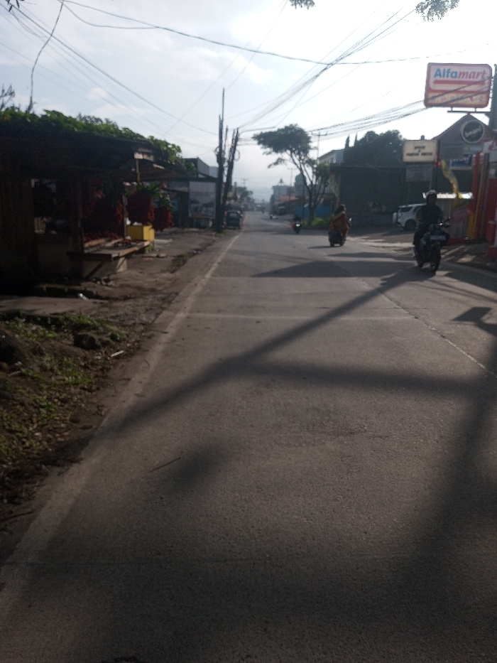 A street scene presents a quiet, sunny day. A narrow road stretches into the distance, marked with long shadows. Motorbikes move along the road. On the right, an "Alfamart" sign is visible above a building. A small structure with produce is on the left side. Trees and power lines are overhead.