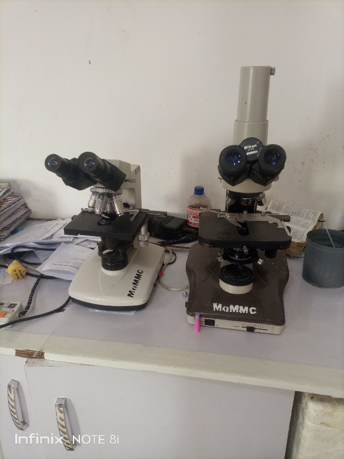 The scene depicts an indoor laboratory or clinical setting located in Unknown, Unknown. No individuals are present. The primary subjects are two compound microscopes positioned on a light-colored desk or countertop against a plain white wall. The microscope on the left is off-white, featuring a black stage, silver objective turret, and binocular eyepieces, with "MoMMC" inscribed on its base. To its right, a dark brown/grey microscope is situated, also displaying "MoMMC" on its base and "Nikon" branding on its binocular eyepieces. This microscope similarly has a black stage and silver objective turret, with a pink cylindrical object protruding from its front base. The desk surface is cluttered with various items. To the far left, a stack of papers or binders is present. Loose white papers, black electrical cables, and a yellow electrical adapter are scattered around the microscopes. A blue-capped plastic bottle with a red label, reading "RUDAK," is located behind the dark brown microscope. On the far right, a grey plastic bucket is partially visible. The desk's front edge shows minor damage, with chipped material. Below the desk, two white cabinet doors with striped, reflective handles are visible. The wall behind the desk is unadorned and shows minor scuff marks.