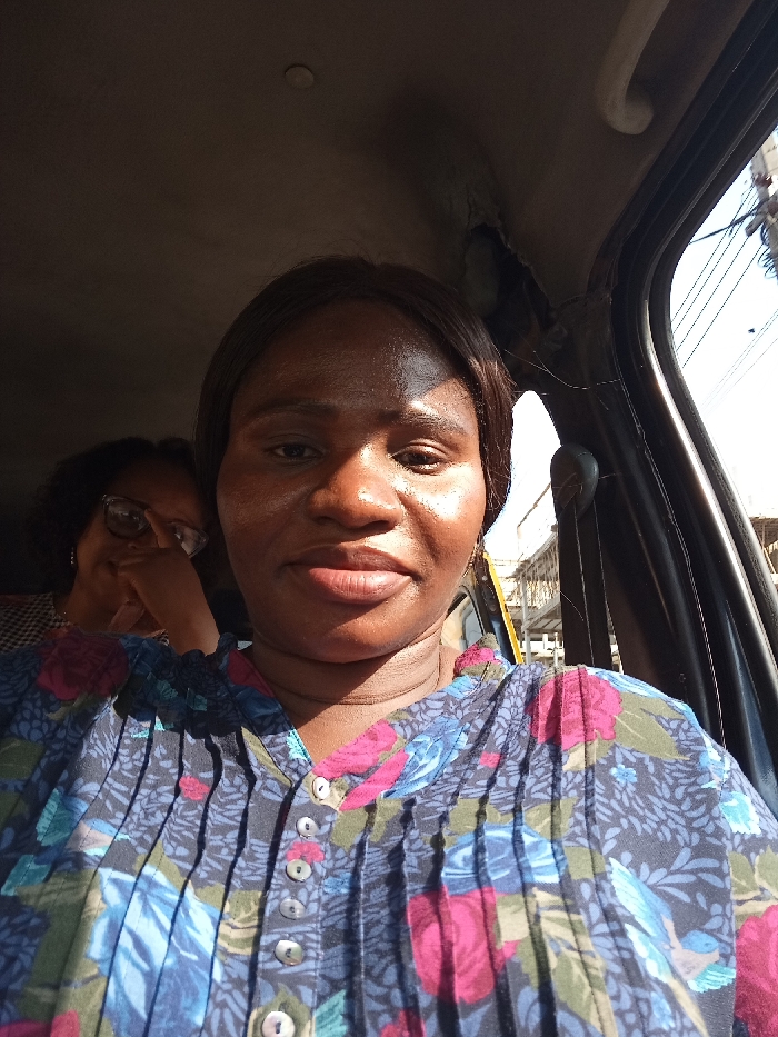 Two women are in a vehicle. The main focus is a woman in the foreground, facing the camera. She wears a floral blouse with blue and pink patterns and has dark hair pulled back. In the background to the left is another woman with dark, curly hair and glasses, partially obscured. The car interior is visible, including the roof, a handle, and the window frame. Outside the window, a building and power lines are partially visible under bright daylight.