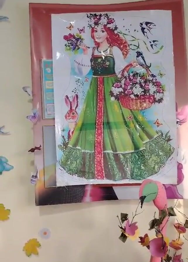 portion of a wall decorated with images and cutouts. On the right side of the frame is a framed picture of a woman in a green dress holding a basket of flowers. Near the picture is a pink flamingo statue with artificial flowers. Scattered on the wall are paper cutouts of butterflies, birds, leaves, and a smiling sun. The overall impression is that the room is decorated with a spring or nature theme.