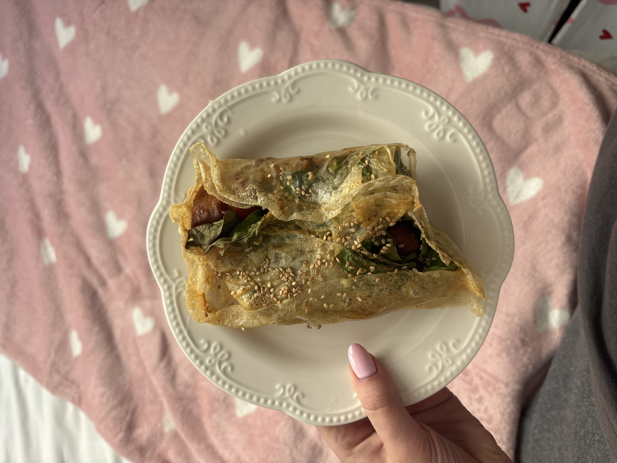 The image displays a close-up, high-angle view of a single person's left hand holding a plate of food, set against a domestic background. The scene is located in Getafe, Spain. **Subjects and Objects:** A single wrapped food item rests on a white, ornate plate. The food item is an elongated roll, encased in a light brown, possibly fried or baked, translucent wrapper. It is generously topped with sesame seeds. Visible through the wrapper are green leafy components, likely spinach or similar greens, and reddish-brown pieces, possibly meat or vegetables, suggesting a savory filling. The plate has a scalloped edge with a beaded rim and an embossed, floral-like pattern on its surface. **People and Actions:** A left hand, with manicured nails painted in a light pink hue, supports the plate from below, indicating the individual is holding the food. The hand's thumb is visible on the upper left side of the plate, while the fingers are obscured beneath it. **Environment:** The background consists primarily of a soft, pink blanket or textile featuring numerous repeating white heart patterns. A small portion of a plain white sheet or fabric is visible in the upper left corner. In the lower left, dark grey fabric, possibly clothing like sweatpants, is partially visible, suggesting the person is seated or reclined.