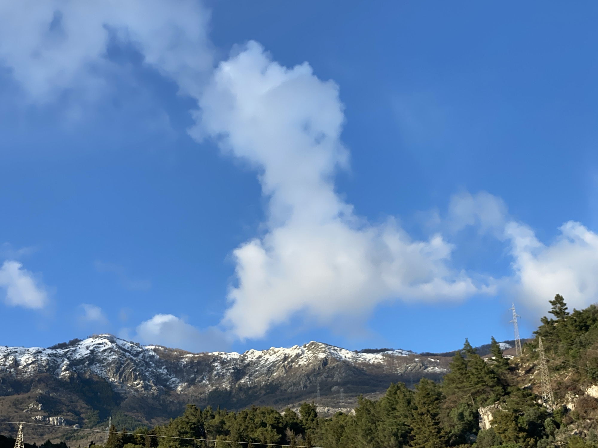 The image depicts a panoramic view of mountainous terrain under a clear blue sky with scattered white cumulus clouds, located in Budva, Montenegro. The central and left portions of the midground feature a rugged mountain range with prominent peaks partially covered by snow. The lower slopes of these mountains display darker rock formations and sparse deciduous vegetation. In the foreground and lower midground, a dense band of dark green evergreen trees, primarily conifers, obscures the base of the mountains. On the far left, a segment of a metal lattice-style electricity pylon is visible, with power lines extending horizontally. On the right side, a second, taller metal lattice-style electricity pylon stands on a steep, tree-covered hillside, with visible power lines. No people, animals, or active interactions are present in the scene. The lighting suggests daylight conditions.
