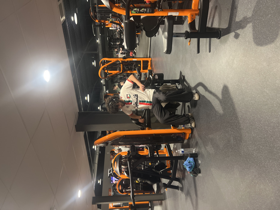 A person in a white soccer jersey with the Palestinian flag and the word "فلسطين" in Arabic is working out at a gym. They are using a seated row machine, with their legs extended and hands gripping the handles. The gym is brightly lit with orange and black equipment. A water bottle and towel sit on the machine next to them. Other gym equipment and people are visible in the background.