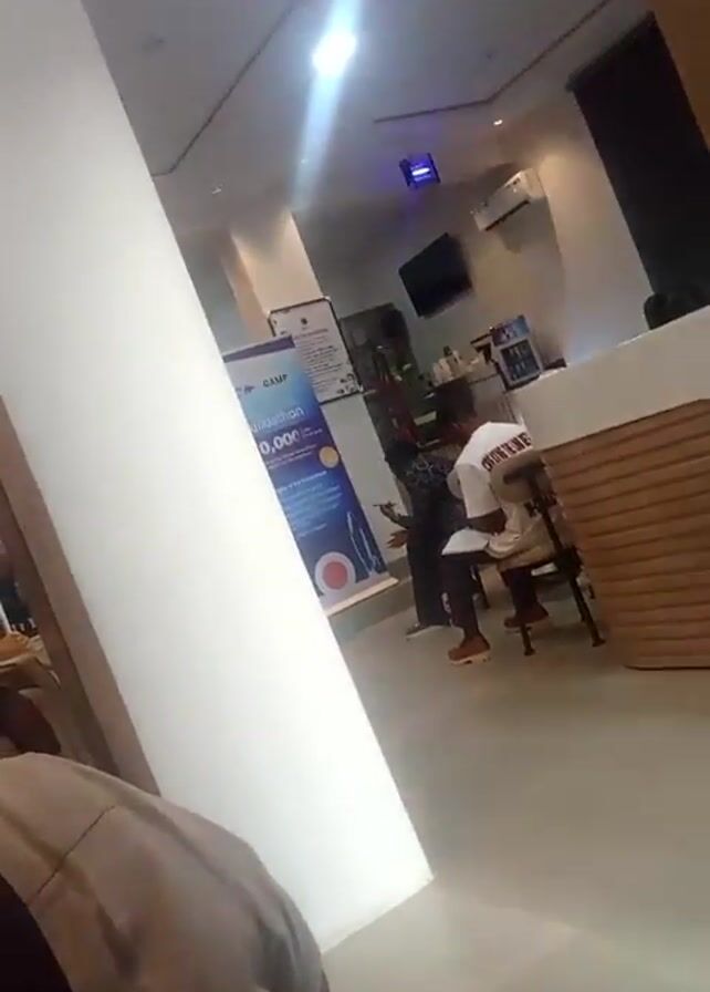 view of a waiting area in a modern, well-lit interior. There's a large white pillar in the foreground, slightly obscuring the view. Behind the pillar, two individuals are present: one is seated on a chair, wearing a white shirt, while another stands nearby. Further back, there's a counter or reception desk, a television mounted on the wall, an air conditioning unit, and a promotional poster for "CAMP" that mentions "10,000.00". The waiting area has light-colored flooring. A portion of a person wearing a grey hoodie is visible in the lower-left corner of the frame.