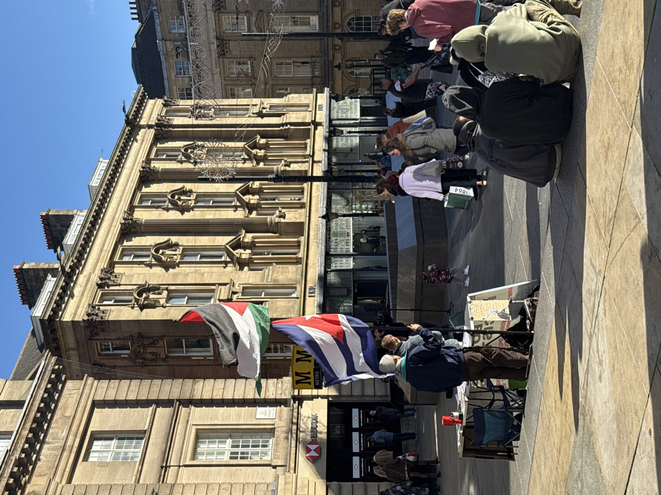 The image depicts a bustling pedestrian square in Newcastle upon Tyne, United Kingdom, specifically at the junction of Grey Street, Grainger Street, and Blackett Street, adjacent to Grey's Monument. The location is confirmed by the visible "HSBC" bank on a building to the left, a street sign "OLD GREY STREET" below it, and "M M METRO" signage for a subway entrance. A prominent multi-story building in the background, exhibiting classical architectural features with columns and ornate windows, displays "END." on its lower facade, identifying it as "END. Clothing." The scene is brightly lit by direct sunlight, casting sharp shadows on the light-colored paved ground. Overhead, white snowflake-shaped street decorations are visible, indicative of the winter season. In the mid-ground, a makeshift stall is set up, featuring a collapsible table with a red cup and other items. A blue folding chair is positioned beneath the table. A tall pole displays two flags: an upper Palestinian flag (horizontal black, white, green stripes with a red triangle at the hoist) and a lower flag, identifiable as the Cuban flag (horizontal blue and white stripes with a red triangle and white star at the hoist). A man in a blue jacket and grey beanie stands behind the table, appearing to manage the flag display. Approximately fifteen individuals are present within the frame. In the lower right foreground, three individuals are seated on the paved ground, their backs to the camera, wearing hoodies in dark, black, and olive green colors. Other pedestrians are observed walking throughout the square. One individual carries a green shopping bag, and a young child in a dark, patterned coat stands near a low, multi-faceted concrete structure in the mid-ground. The area functions as an active urban thoroughfare and gathering space.
