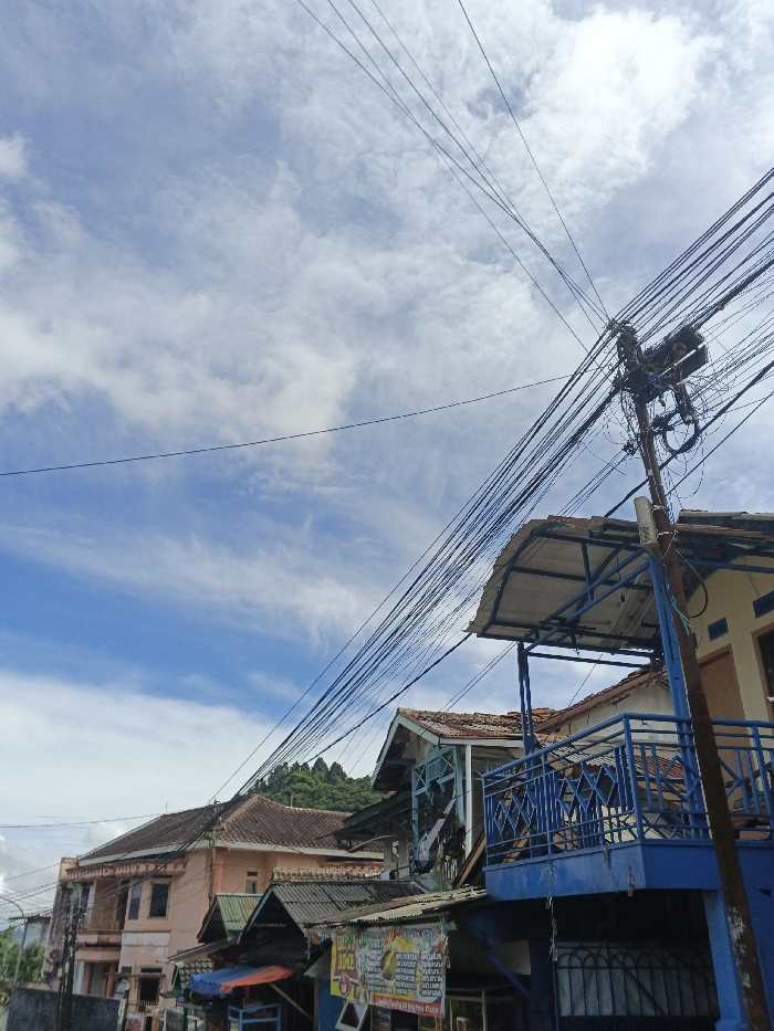 The image displays a cluttered urban street scene with an emphasis on overhead utility infrastructure and diverse architecture under a partly cloudy blue sky