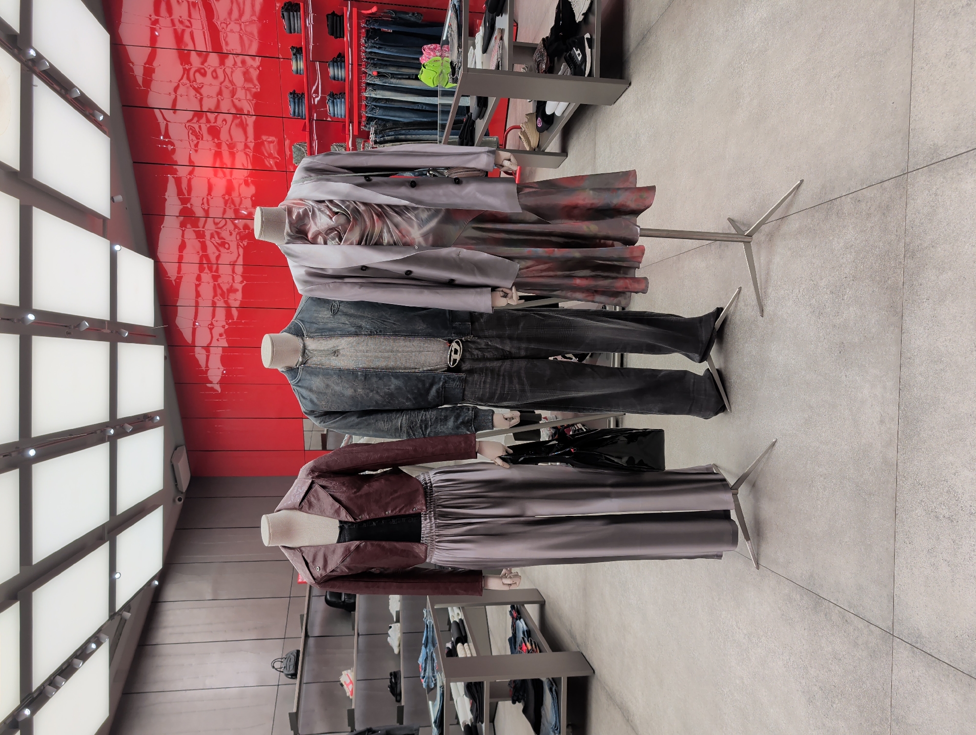 n indoor retail space with three mannequins standing in a row. The mannequins display different outfits: the top mannequin wears a light gray coat and a long patterned skirt; the middle mannequin wears a denim jacket, dark jeans, and a belt with a large buckle; and the bottom mannequin wears a brown leather jacket and a long gray skirt, holding a black bag. The background includes a red panel wall and shelves with folded clothes and shoes. The floor is a light gray tile. The location is likely in a city but can not be determined.
