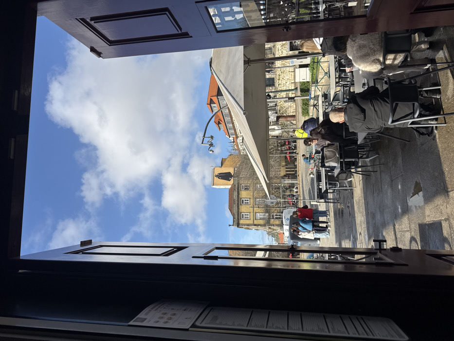 The image captures an outdoor street scene in Vila Nova de Gaia, Portugal, viewed from inside a dark doorway. The perspective is framed by dark brown, partially open double doors. The left door panel displays a white multi-sheet menu or information board. Beyond the doorway, a brightly lit outdoor cafe patio unfolds under a blue sky with scattered white cumulus clouds. The ground is paved with stone, showing several wet, reflective patches. Two large, light-colored rectangular patio umbrellas extend over seating areas. Several individuals are present on the patio and street. In the immediate midground, a bald individual wearing a black jacket sits with their back to the camera at a dark table, facing another person in a light-colored, fluffy jacket. At an adjacent table, two individuals with dark hair are seated, facing away from the camera, with a large grey shoulder bag resting on their table. Further back on the patio, a person in a yellow high-visibility vest is seated at a table. To the left of the patio, on the cobblestone-like street, a group of approximately four people, including one in a red jacket, are standing and interacting. In the background, historical-style buildings with varying facades are visible. A prominent yellowish building features a large, dark mural depicting a cloaked figure. Other buildings with red-tiled roofs and windows are present. Sparse, leafless deciduous trees line parts of the street. A curved street light pole with two attached security cameras extends over the scene. A white van is partially visible in the distance on the street.