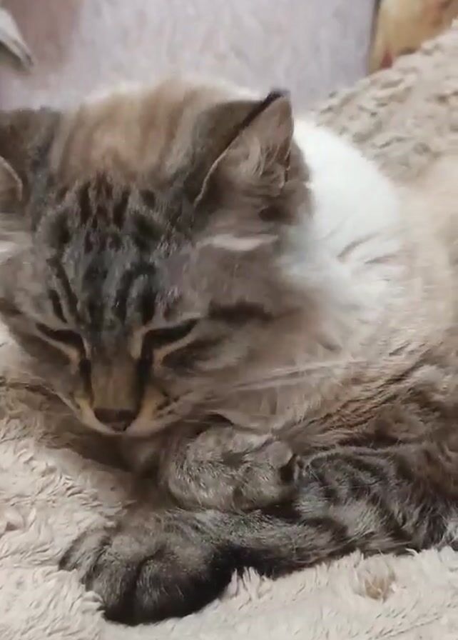 fluffy tabby cat lying on a soft, textured blanket. The cat is mostly white and light brown with tabby markings on its head, back, and paws. It appears to be relaxed, with its eyes mostly closed. The cat lifts its head slightly and licks its paw with a pink tongue, then settles back down. The blanket is a light beige color and has a fluffy texture. In the background, there is a beige patterned wall and some indistinguishable items. There is also music playing in the background.
