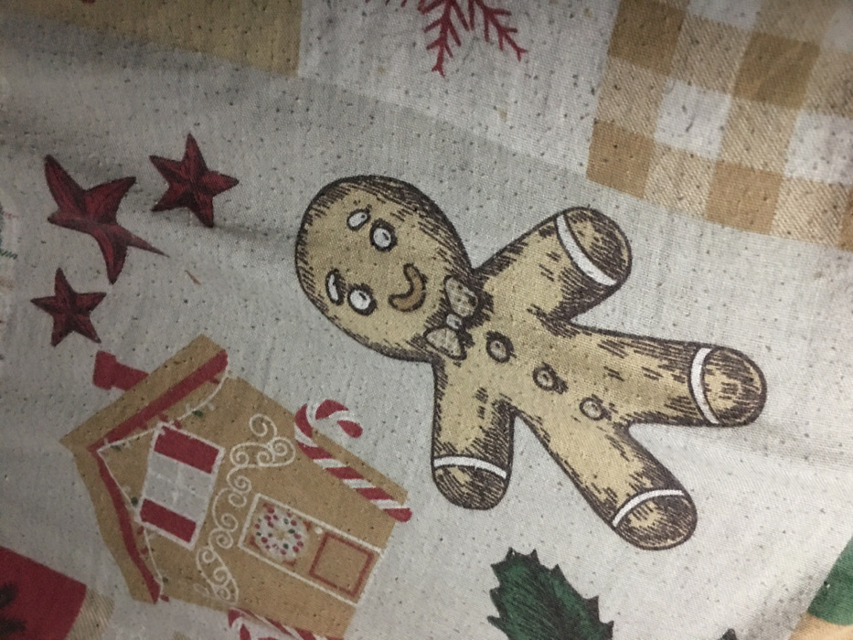 A close-up shot depicts a festive Christmas-themed pattern on fabric. Elements include a gingerbread man with white icing details, red stars, a gingerbread house adorned with candy canes, holly leaves, a red snowflake, and a brown and white gingham square. The design is printed on a textured, off-white background with tiny specks.