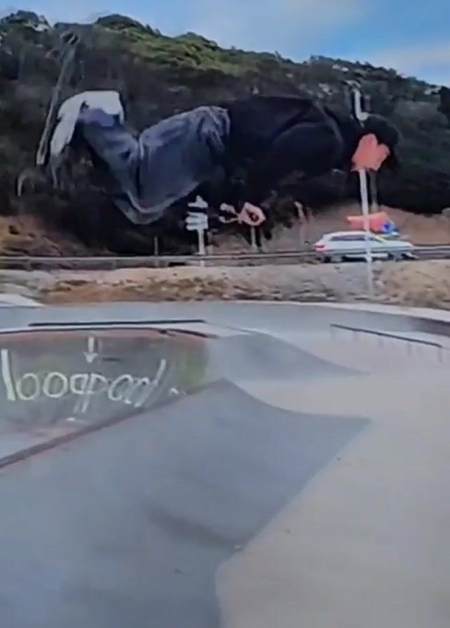 A person dressed in dark clothing is performing a flip on a scooter at a skate park. The skate park has concrete ramps and bowls, with trees and a road visible in the background. A white car is seen driving on the road. A person on a bicycle is also visible in the background.