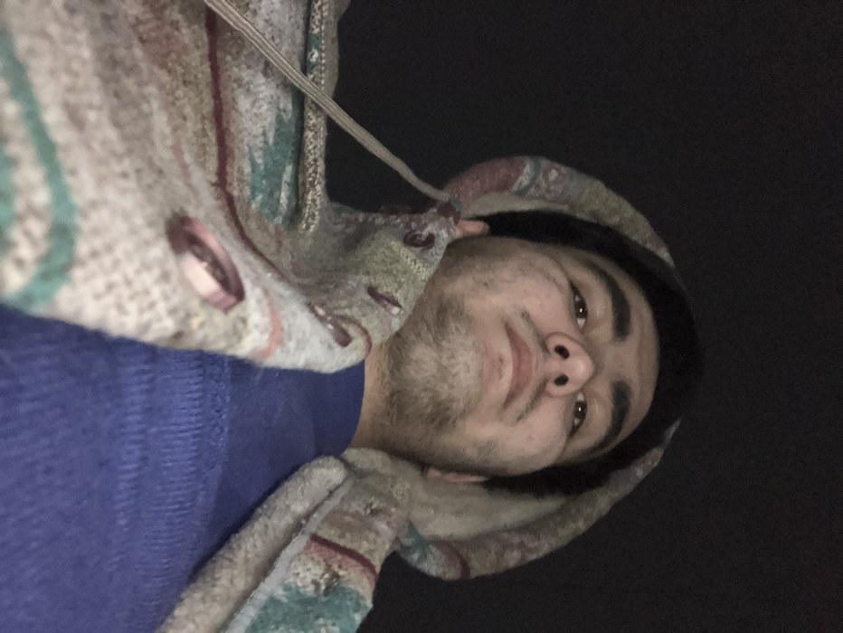 A single male individual is depicted in a low-angle portrait shot. He possesses dark hair and light facial hair, including stubble on his chin and upper lip. He is looking directly forward, slightly upward, with a neutral expression. He wears a hooded outer garment, likely a jacket or coat, made of a textured, possibly knitted or woven fabric, patterned with shades of beige, green, and reddish-pink. A light-colored drawstring is visible on the hood, and a pinkish loop or toggle element is present on the garment's front. Underneath, a solid blue garment, possibly a sweater, is visible. The background is uniformly dark and undifferentiated, providing no discernible environmental features. The lighting appears to originate from below or directly in front of the subject. The specific location within Namangan City, Uzbekistan, cannot be determined from the visual information present in this image.