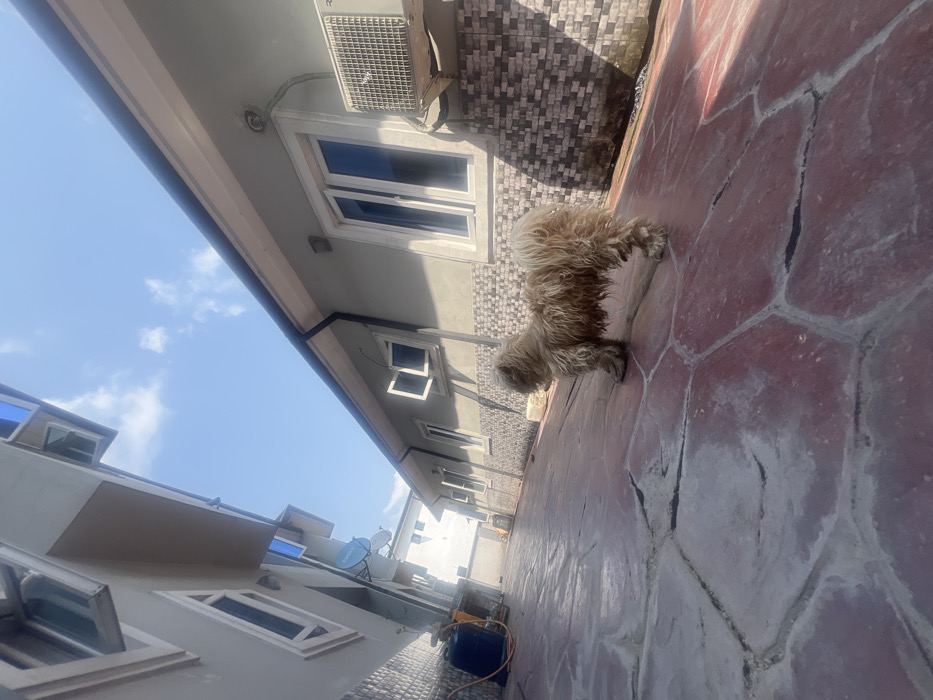 The scene depicts a narrow paved alleyway between two light-colored buildings under a bright blue sky with sparse white clouds. The location is Rumuofa, Nigeria. **Subjects:** * A small, tan-colored, shaggy-haired dog stands in the foreground, facing left, positioned on the reddish-brown paved ground. Its fur appears somewhat matted or damp on its lower body. No other sentient beings are visible. **Objects:** * **Left Building:** A multi-story structure with light grey walls and multiple white-framed windows, some exhibiting a blue tint. The lower portion of the wall features dark-toned tiling. A blue cylindrical object, possibly a gas cylinder, is positioned at the base of this building with an attached hose. A white satellite dish is mounted on its exterior. * **Right Building:** A single-story structure with light grey walls and white-framed windows. One window near the center is partially open. The lower portion of this wall also features dark-toned tiling. An external air conditioning unit is mounted on the wall above the tiled section, to the right of a large window. A dark eavestrough system runs along the roofline. * **Ground:** The ground is a reddish-brown paved surface with irregular, polygonal patterns, consistent with stamped concrete or large tiles. It shows areas of lighter discoloration and some dark lines in the crevices. **Environment:** * The sky is clear and bright blue, indicating a sunny day. * Strong direct sunlight illuminates the scene, creating distinct shadows on the ground and along the right building's lower wall, cast by the building itself. The perspective is low to the ground, looking upwards between the buildings.