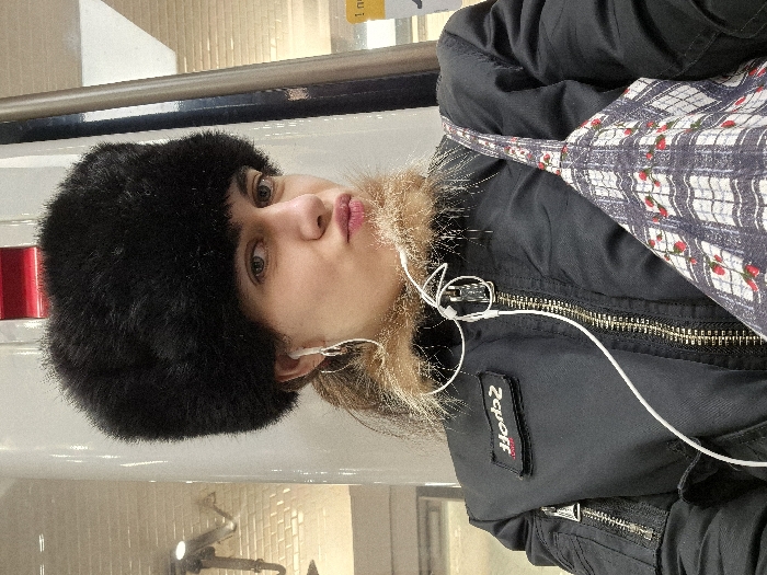 A person wearing a black furry hat and a dark jacket with a fur-lined collar poses in front of a blurred background. White earbuds dangle from their ears. A patterned tote bag rests on their shoulder. The jacket features a zippered front and a logo patch. The background appears to be a public space with tile walls and metallic fixtures.