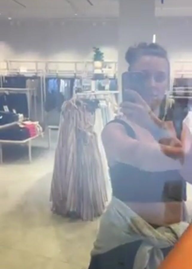 A woman is taking a selfie in front of a mirror in a clothing store. She is wearing a black tank top and shorts with a light-colored sweater tied around her waist. The mirror reflects clothing racks with various garments, mannequins, and store lighting. The selfie includes a partial view of the store's interior.